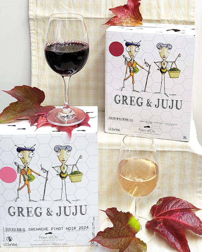 Greg & Juju Rouge Pays d'Oc IGP Grenache mit Pinot Noir, 3l-Bag-in-Box von Domaines Robert Vic 18,95 € (Liter 6,32 €)